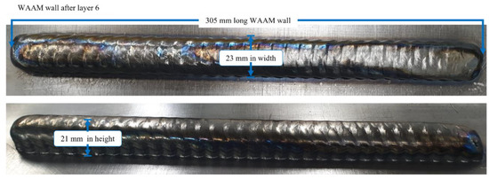 Figure 7 shows a completed deposition of the experimental wall after layer six with a measured height of approximately 21 mm with an average layer height of approximately 3.5 mm. A width of 28 mm and a length of 305 mm were also measured.