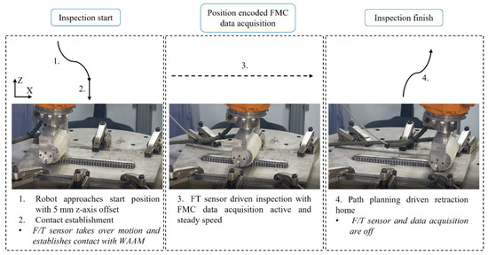 The NDE was initiated within the first 2 min of the deposition robot’s retraction to its home position. Figure 8 shows a step-by-step inspection diagram, where at first, the inspection robot’s end-effector approached the wall with a travel speed of 50 mm/s until the position 5 mm above the predicted as-built surface of WAAM was reached.