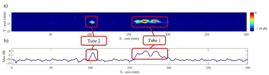 Following a visual analysis of the results, a maximum amplitude along an X-axis was presented in Figure 9b. Based on this plot, a Signal-to-Noise ratio (SNR) of up to 12 dB was achieved from the scanning of Tube 1 while an SNR of 10 dB was seen for Tube 2. Considering the dry-coupling condition, these SNR values were found sufficiently high for the indications to stand out from the background noise and be readily detected by the operator.