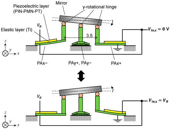 Figure 2 shows the actuation principle. Three voltage inputs are required to drive this scanner: there are variable voltage inputs and to drive the x- and y-axes, respectively, and a fixed bias voltage . The lower electrode (elastic layer side) of PAx+ is grounded, and a constant bias voltage is applied to the upper electrode (piezoelectric layer side) of PAx−. When V, the potential difference applied to PAx+ is 0 V; therefore, no displacement occurs in PAx+. Conversely, because the potential difference at PAx− is , the piezoelectric actuator PAx− warps upward. This lifts the edge of the mirror near PAx− and rotates it in a positive direction around the y-axis, while when , the mirror rotates in a negative direction around the y-axis. By continuously changing , the deflection angle of the mirror can be controlled. When , the mirror is horizontal (the tilt angle is zero). In this case, only the y-rotational hinges act as hinges in the mechanism, not the x-rotational hinges. The motion by PAx+/− is not transmitted to the orthogonal actuators PAy+/−, owing to the y-rotational hinges. This allows us to decouple the drive of each axis. Because this mechanism is symmetrical in the x- and y-axes, the above explanation is the same when actuating PAy+/−.