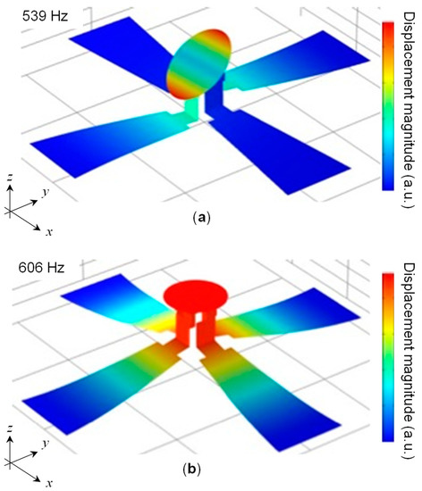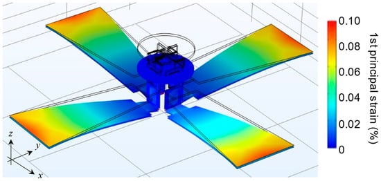 Finite element analysis (FEA) was used to analyze the characteristics of the design. Because the scanner is made entirely of thin plate structures, a shell model was used for the FEA modeling. Please refer to the Appendix A for the detailed material properties. The software used was COMSOL Multiphysics (COMSOL Inc., Burlington, MA, USA). Figure 3 shows the results of the resonance frequency analysis. The tilting motion of the mirror was the first mode with a frequency of 539 Hz. The second mode was an up-and-down vibration with a frequency of 606 Hz. The tilt angle of the mirror when voltage was applied was 0.136°/V, as determined by a linear static analysis. From this analysis, the maximum first principal strain in the piezoelectric material at a drive voltage of 140 V (the maximum voltage in the experiment) was calculated to be 0.16%. Since the fracture strain of a PIN-PMN-PT of similar dimensions is approximately 1.2% [33], this design was determined to have a sufficient margin. In addition, a shock load analysis was conducted in accordance with MIL-STD-883E [34], in which an acceleration of 3000 G was applied for 0.3 ms. Figure 4 shows the deformation shape and strain distribution at the moment of maximum strain. In this case, a maximum first principal strain of 0.11% occurred at the fixed end of the actuator; this value is sufficiently smaller than the fracture strain.