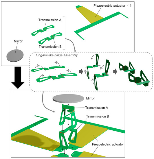The scanner consists of three main parts: a mirror, transmission, and piezoelectric actuator (upper part of Figure 5). The mirror was constructed by laser cutting a 300-μm-thick silicon wafer. The transmission is a laminated structure of titanium and polyimide, as described above. It was fabricated by bonding pre-patterned titanium and polyimide layers via thermocompression bonding. A detailed fabrication process is reported in [35]. The piezoelectric actuators were fabricated by bonding PIN-PMN-PT and the titanium layers with an epoxy resin (Quick 5; Konishi Co., Ltd., Osaka, Japan), and PIN-PMN-PT with an Au electrode was manufactured by TRS Technologies, Inc. (State College, PA, USA). Four piezoelectric actuators, two transmission parts, and a mirror were assembled, as shown in the lower part of Figure 5. Here, the hinge components, fabricated in a planar form, are assembled into a three-dimensional form, similar to origami, as shown in the middle portion of the figure. A UV-curable adhesive (Loctite 4305; Henkel AG & Company, Düsseldorf, Germany) was utilized to join the parts.