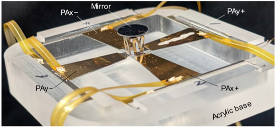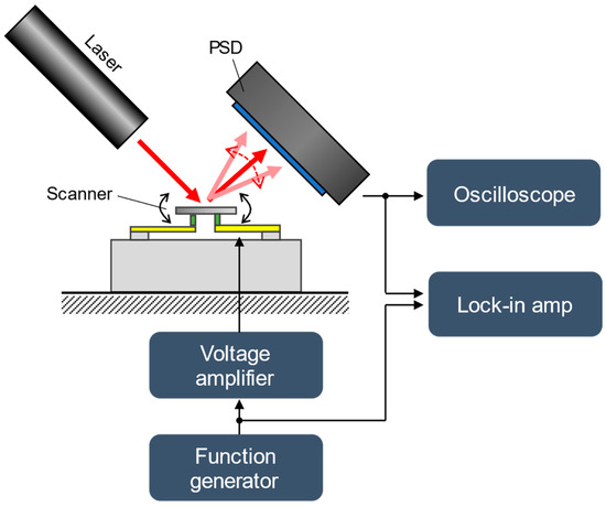 The evaluation system is shown in Figure 6. A red laser beam (37-029; Edmund Optics Corp., Barrington, NJ, USA) was utilized to irradiate the circular mirror surface from an angle. The position of the reflected laser was measured using a position sensitive detector (PSD) (PDP90A; Thorlabs, Newton, NJ, USA), and the tilt angle of the mirror was calculated from the position of the reflected light. A combination of a waveform generator (4054 B; BK Precision, Yorba Linda, CA, USA) and multichannel voltage amplifier (HJPZ-0.3P×3; Matsusada Precision Inc., Kusatsu, Japan) was used to drive the piezoelectric actuator. A lock-in amplifier (HF2LI, Zurich Instruments AG, Zurich, Switzerland) was used to measure the frequency response. An oscilloscope (4824A; Pico Technology, Cambridgeshire, UK) was used to record the mirror angle, such as when measuring the voltage-angle characteristics.