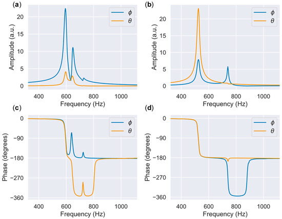 Frequency response: Frequency-amplitude characteristics under (a) x-axis actuation and (b) y-axis actuation; frequency-phase characteristics under (c) x-axis actuation (PAx+/−) and (d) y-axis actuation (PAy+/−).