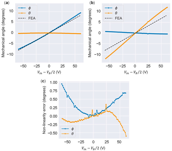 Voltage-angle characteristics: (a) x-axis and (b) y-axis actuations and (c) nonlinearity error.