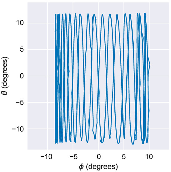 Figure 8 shows the frequency response characteristics. In this experiment, a frequency sweep over a certain range of a sine wave of an amplitude of 1 V was conducted, and the amplitude and phase of the mirror angle were measured. The mirror rotation angle around the x-axis is defined as , and the mirror rotation angle around the y-axis is defined as . Figure 8a shows the amplitudes of and when a sinusoidal drive voltage is applied to PAx+ and PAx−. Figure 8b shows the amplitudes of and when PAy+ and PAy− are also driven. Figure 8c,d show the phase graphs when PAx+/− and PAy+/− are driven, respectively. The resonant frequency is the frequency at which the maximum amplitude is reached, and the phase is −90°. The resonant frequencies around the x-axis () and y-axis () are 594 Hz and 524 Hz, respectively. Considering an amplification ratio of +1% or less as the quasi-static drive range, the operating frequency range is 1/10 of the resonance, 52–59 Hz, with the quality factor of approximately 20. This is similar to the practical value for the display and radar refresh rates. Figure 9a,b shows the mirror angle versus the applied voltage. The FEA results are represented by dotted lines. The bias voltage was set to 140 V, and the drive voltage was varied between 0 and 140 V. The mirror becomes horizontal when . When PAx+/− is driven, the range of change in is 17.2°, and when PAy+/− is driven, the range of change in is 24.4°. The average angle range was 20.8°; therefore, a large amplitude motion was achieved. The tilt angle per unit voltage was 0.149°/V, which is in good agreement with the FEA result of 0.136°/V. The resonant frequency also matched the experimental result and the FEA (559 Hz on average for the two axes and 539 Hz, respectively), indicating that the structure was fabricated as designed. In this experiment, the unimorphs were assembled by hand, and variations in the amount of adhesive applied during assembly possibly caused this error. The difference in resonant frequency is estimated to be due to the difference in stiffness caused by the assembly error of the unimorphs. There is a correlation between the resonance frequency , the spring constant of the unimorph, its thickness , and its length given by the expression . Thus, the 13% difference in corresponds to an error of 8.5% in terms of and . The difference in the tilt angle per unit voltage is smaller on the x-axis where is higher, i.e., in the direction where is estimated to be higher. Therefore, a primary cause seems to be that a large inhibits the actuation. Furthermore, the variation in the piezoelectric constants would combine to produce asymmetry in the tilt angle characteristics. To improve the asymmetry of the characteristics, the manufacturing and assembly process of unimorphs should be made uniform. For the ranges of crosstalk, the change in when driving PAx+/− was 0.59°, and the change in when driving PAy+/− was 1.47° in the drive voltage range of −70 to +70 V. The change in crosstalk when driving PAy+/− was larger; however, it was less than 6% of the main drive angle range. The decoupling mechanism realized minimal crosstalk. If the geometry is ideally symmetrical, coupling should not occur. The main cause of coupling is assumed to be symmetry breaking during the transmission assembly; because the transmission is assembled manually, the process is prone to errors. The insertion part for attaching the transmission to the actuator tip has a margin of 0.4 mm of width to facilitate fitting. Therefore, a maximum error of ±0.2 mm can occur in the assembly position. Because the distance from the hinge to the center of mirror rotation is 1.75 mm, an orthogonality error could produce a coupling of 0.2 mm/1.75 mm = 11.4% at most. Figure 8c shows the nonlinearity (deviation from a linearly fitted line) of the voltage-mirror angle. The nonlinear error is small, less than 1°, indicating that high linearity has been achieved by this design. A 2D scanning demonstration result using this scanner is shown in Figure 10. Here, PAx+/− was driven by a 1 Hz sine wave and PAy+/− was driven by a 20 Hz sine wave. We attempted to draw a 1:20 Lissajous figure. The voltage amplitude was set to 140 V for both axes. As shown in the figure, the Lissajous figure was drawn with little distortion, and it was confirmed that each axis maintained a high independence, even when the two axes were driven simultaneously.