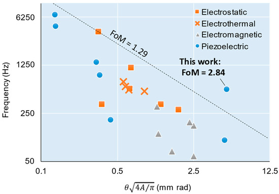 Next, the level of achievement for this scanner was compared to those of previous scanners. Here, we adopted the figure-of-merit (FoM) proposed in a review report [36] as the measure of scanner performance. The FoM is calculated as , where , , and are the optical scanning angle amplitude, area of the mirror plate, and resonant frequency, respectively. Table 1 lists the performances and FoMs of the previously reported two-axis non-resonant scanners. Figure 11 shows a graph of on the horizontal axis and on the vertical axis. As listed in the table, the new scanner achieved a higher FoM than that of conventional scanners. In particular, a large deflection angle and a high resonant frequency are achieved in a large-area mirror, which are outstanding features. These features are superior to commercial piezoelectric scanners in some respects because commercial scanners with commonly used stacked piezoelectric elements currently have scan angles of only a few degrees at most. For example, S-335 (Physik Instrumente GmbH & Co. KG, Karlsruhe, Germany) has a scan angle of 2°, a resonant frequency of 1.6 kHz, and a FoM of 0.70. PSH25 (Piezosystem Jena, Jena, Germany) has a scan angle of 1.1°, a resonant frequency of 1.4 kHz, and a FoM of 0.35. In addition, for piezoelectric actuators that are capacitively loaded, large capacitance leads to the drawback of requiring large power. Stacked piezoelectric actuators have capacitance as large as several μF (e.g., 6.2 μF and 1.64 μF for the two products mentioned above, respectively). In contrast, the capacitance of our scanner is two orders of magnitude smaller at 25 nF, owing to its single layer actuator. In other words, this scanner exhibits the advantage of low power consumption.