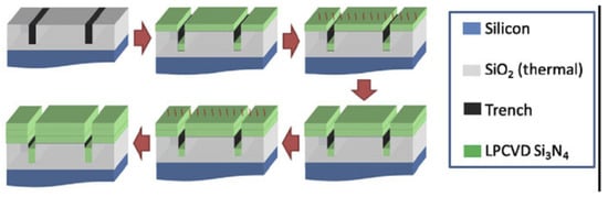 Schematic thermal cycling process. Trenches are formed and then, a 350 nm film of Si3N4 is deposited via LPCVD and annealed at 1200 °C. The same process is repeated to achieve the desired thickness. Reproduced from [22] under a CC BY 4.0 license.