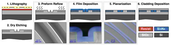 Damascene reflow process steps including lithography, preform dry etching, preform reflow, LPCVD Si3N4 deposition, planarisation and cladding deposition. Reproduced from [21] under a CC BY 4.0 license.
