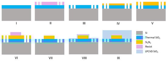 Multistep annealing process flow: (I) thermal oxidation, (II) photolithography, (III) SiO2 HF etch, (IV) Si3N4 deposition and annealing at 1100 °C, (V) second Si3N4, (VI) E-beam lithography, (VII) Si3N4 etch, (VIII) LPCVD SiO2 deposition and annealing at 1100 °C and (IX) PECVD SiO2 deposition. Reprinted with permission from [31], ©2019 The Optical Society.