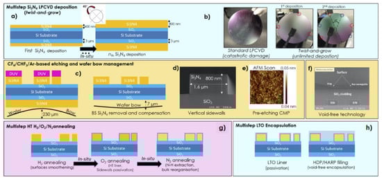 In 2018, El Dirani et al. developed a deposition technique known as twist-and-grow illustrated in Figure 4, that has been used to produce thick Si3N4 layers (>1 ) in a standard large-format fabrication line [33]. The fabrication begins with a blanket 200 mm silicon substrate with a 3 thermal oxide layer, on which a 800 nm thick Si3N4 film is deposited in two steps using the twist-and-grow technique [34,35]. In this method, the layers are deposited by means of LPCVD at 780 °C with a deposition rate of <2 nm/min that enables the production of films with minimal hydrogen content. In between steps, the wafer is cooled down to 630 °C to eliminate stress-related cracks and rotated by 45° to redistribute the uniaxial stress that can significantly bow the wafer. The wafer then goes through a CMP step to reduce the surface roughness before patterning the waveguides using DUV lithography and inductively coupled plasma etching (ICP) with a tailored CF4/CHF3/Ar that minimises sidewall roughness. The resist and any etching residues are removed with an O2 plasma and the surface is cleaned with a H2SO4 solution before selectively etching the Si3N4 on the backside of the wafer to alleviate the tensile stress that can appear after patterning to ensure that the wafer can continue its fabrication in the process line. In order to reduce the propagation losses, the patterned wafer is annealed at 1100 °C for a few minutes in H2 to smoothen the sidewalls, at 1200 °C in O2 to encapsulate the waveguides with a native oxidation to reduce scattering centres, and at 1200 °C for 3 in N2 to drive out the hydrogen impurities that contribute to the absorption of the material in the NIR. As a last step, the waveguides are encapsulated with a TEOS and a LTO layer deposited by high-density plasma-enhanced chemical vapour deposition (HDP-ECVD). Using this fabrication process the authors have not only demonstrated 1600 × 800 waveguides with propagation losses of dB/cm at 1560 nm [33], but they have also demonstrated a largely scalable process with high reproducibility that has potential for applications that require thicker layers.