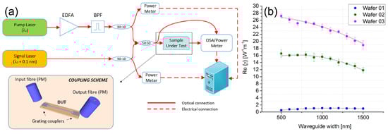 where is the angular frequency, is the nonlinear refractive index, c is the speed of light, is the effective area and is the two-photon absorption (TPA) coefficient. The real part of Equation (1) (also known as ) describes the Kerr response of the optical waveguide and introduces a nonlinear phase shift to the propagating light. The imaginary part of the Equation (also known as ) represents the TPA response, that accounts for the power-dependent nonlinear losses that the optical signal undergoes during propagation. The values of for the different Si-rich SiN layers were experimentally measured by using a continuous-wave (CW) four-wave-mixing (FWM)-based scheme [39], whose experimental setup is shown in Figure 5a. A pump laser (wavelength = nm, optical power ranging from 20 mW to 2 at the waveguide input GC) was amplified by a polarisation-maintaining Erbium-doped fibre amplifier (PM-EDFA) and then was sent to an optical band pass filter (BPF) to filter out the EDFA-generated amplified spontaneous emission (ASE) noise. A 50:50 fibre coupler was employed to combine the pump with a weaker CW optical signal (the signal optical power was always kept at least 10 dB below the pump power level) generated by a tunable external cavity laser (ECL). GCs were used to couple the two optical waves into the waveguides under test. A FWM-induced idler at a new frequency was generated in the waveguide and the three signals were coupled back to a PM fibre by means of an output GC. By recording optical spectra for different pump power levels, the coefficients of the fabricated waveguides were derived using the following equation:
