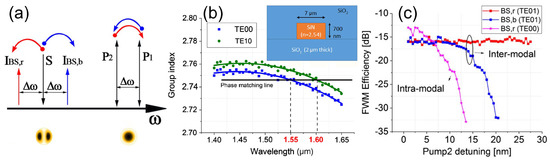 (a) Operation principle of the dual-pump IM-BS-FWM process: energy is transferred directly from the signal (S) to two idlers ( and ) and between the two pumps ( and ). (b) Numerically simulated group index curves for a Si-rich SiN waveguide (n = 2.54 at 1550 nm), with the waveguide cross-section shown in the inset. (c) BS-FWM efficiency measured as a function of pump detuning for the intermodal and intramodal configurations. Reproduced from [40] under a CC BY 4.0 license.