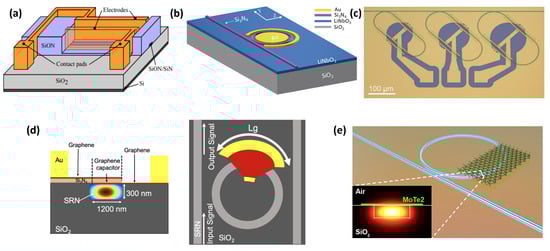 (a) Three-dimensional schematic of EO-polymer integrated in SiN-SiON platform; reproduced from [82] under a CC BY 4.0 license. (b) Schematic of the tunable hybrid SiN-LN microring resonator; reprinted with permission from [83], ©2019 The Optical Society. (c) Top view of hybrid BTO-SiN racetrack resonator; reproduced with permission from [84], ©2019 American Chemical Society. (d) Schematic cross-section of the hybrid waveguides based on graphene capacitors and top view of a microring resonator partially covered by a graphene capacitor; reproduced from [85] under a CC BY 4.0 license. (e) Schematic of SiN ring resonator covered with monolayer-MoTe; reprinted with permission from [86], ©2021 American Chemical Society.
