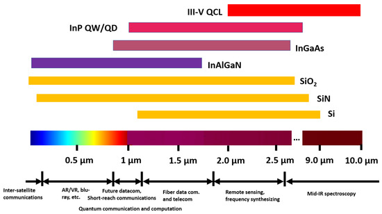 - Morin, T.J.; Chang, L.; Jin, W.; Li, C.; Guo, J.; Park, H.; Tran, M.A.; Komljenovic, T.; Bowers, J.E. CMOS-foundry-based blue and violet photonics. Optica 2021, 8, 755–756. [Google Scholar] [CrossRef]