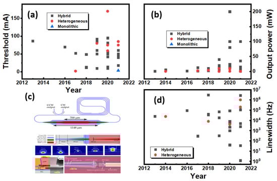- Yang, Y.; Zhao, H.; Ren, X.; Huang, Y. Monolithic integration of laser onto multilayer silicon nitride photonic integrated circuits with high efficiency at telecom wavelength. Opt. Express 2021, 29, 28912–28923. [Google Scholar] [CrossRef]