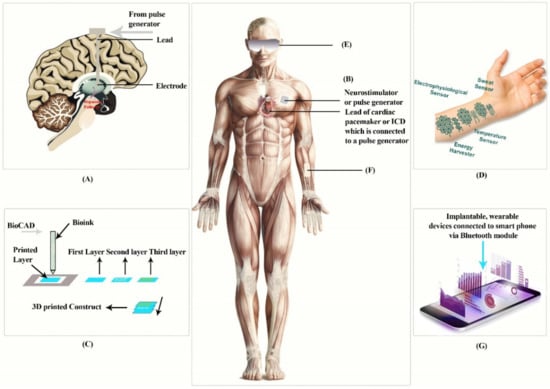 The number of people who have been treated with implanted electronic devices for cardiovascular disease, such as implantable cardioverter defibrillators (ICDs), as well as implants such as deep brain stimulators (known as DBS) for Parkinson’s Disease, etc., has been growing since the 1960s, when cardiac pacemakers were initially introduced [52]. The majority of implanted devices are made up of batteries, biocompatible materials, and programmable circuitry. There are several implantable devices (Figure 1A–D), of which the most popular are implantable cardioverter defibrillators, bioinks and 3D print implants, and deep brain stimulators.