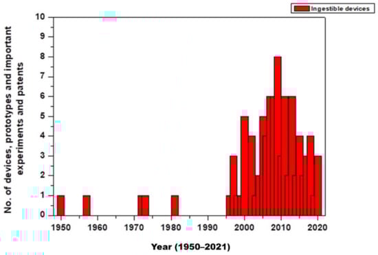 Ingestible pills are safe and a non-invasive approach to monitoring, diagnosing, or releasing drugs at a specific site inside the body. They are used to monitor pH, temperature, blood, other body enzymes etc. These pills are biocompatible in nature. The initial development of such pills was in the 1950s. Since the approvals from the regulatory bodies in the US and Europe in 2000, there has been a rise in the development of such ingestible biosensors. Below is a graph representing the development of such pills (Figure 2) [21].