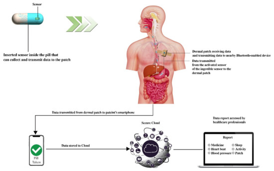 Working diagram of an ingestible pill which represents the components of ingestible pills, the dermal patch which helps in receiving and transmitting data, data stored in the Cloud, and final assessment by a health official. This diagram was redrawn from [61,62].