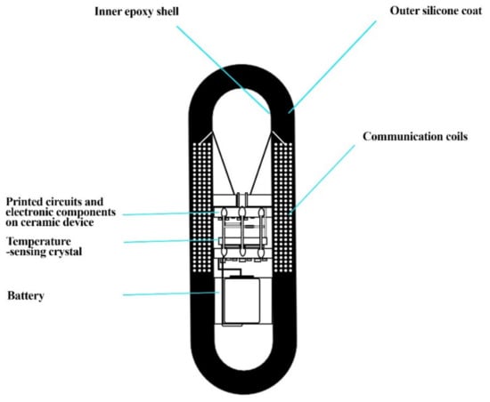 The ingestible thermal monitoring system showing inner epoxy shell, outer silicone coat, printed circuits, temperature-sensing crystal, and communication coils. This diagram was redrawn from [67].