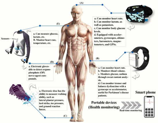 Portable devices can be used for monitoring blood pressure, volume, glucose, and heart rate. They can also be used in combination with smartphones, laptops, etc. Various types of such devices can be categorized under head-mounted devices, wrist mounted devices, e-textiles, etc. (Figure 5A–E) [1], which we study further.