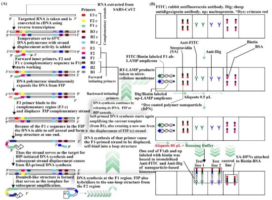 RT-LAMP NBS procedure and working diagram. (A) Procedure for reverse transcription loop mediated isothermal amplification. (B) Nanoparticles-based biosensor. This diagram was drawn from [111,116,117,118].