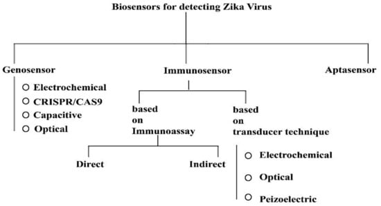 Zika virus is caused through the bite of the Aedes species of mosquito; transmission may include blood transfusion, sexual contact, or from mother to fetus. Several conventional methods were reviewed recently that were used to detect the viral load or through mAbs, but recent studies stressed the importance of POC applications and devices based on biosensors that have played a huge role in detection of Zika virus. Further, there can be three types of biosensors useful for the for the detection of Zika virus; these include: (a) genosensor-, (b) immunosensor-, and (c) aptasensor-based devices (Figure 7) [120].