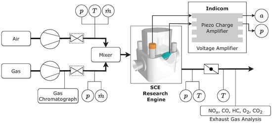 In Figure 1, a sketch of the exhaust side of such an SCE block is shown, where the position of the in-cylinder PS is shown in cyan color and the KS in orange color. Here, p denotes for the pressure, T stands for the temperature and  is the mass flow, while a denotes for the converted engine block vibrations measured by the KS. In addition, the schematic experimental setup is provided that shows the two main supply paths for air and gas, respectively. The air is conditioned by a complex control system to meet the required temperature, boost pressure and water content. The gas composition is determined through gas chromatography. Accurate mass flow measurements are achieved via Coriolis mass flow meters. Furthermore, sensors for temperature and pressure measurements are installed throughout the entire test bed. CA-resolved pressure measurements were generated for the intake and the exhaust manifold as well as for the combustion chamber. The exhaust path is equipped with a back pressure flap to imitate a turbine of a turbo-charger and a unit for exhaust gas analysis that determines the concentration of NOx, CO, HC, O2  and CO2 [].