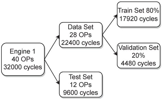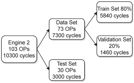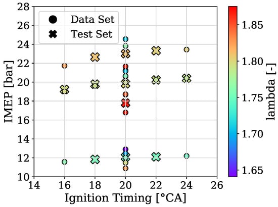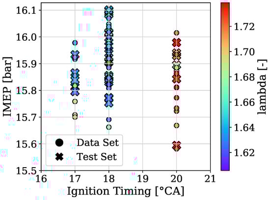 To provide a picture of how the acquired data of engine 1 and engine 2 was split for training, validation and testing Figure 2 and Figure 3 are presented, respectively. In addition, the variation of the three parameters from the used OPs, which are the ignition timing, the indicated mean effective pressure and the air–fuel equivalence ratio (lambda), are shown in Figure 4 for engine 1 and in Figure 5 for engine 2.