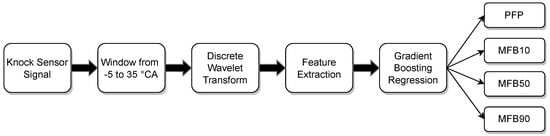 Discrete wavelet transform (DWT) is a multi-resolution decomposition and allows feature analysis associated with different frequency bands []. The received coefficients are resolved in the time and frequency domains and are therefore suitable for the analysis of non-stationary phenomena, as they are expected to be introduced by the complex combustion processes of an engine [,]. This signal-processing technique has proven to be effective in filtering the information of interest from overlayed noise []. In addition, the resulting coefficients of the DWT can be used to extract significant information, delivering a compact representation that can be used for further processing. Numerous gradient-boosting models have been applied successfully in many fields of research. They were implemented, for example, in the following areas: detecting intrusion attacks in wireless sensor networks []; fault detection in heat ventilation and air conditioning systems []; surface roughness prediction in high-speed milling in the metalworking industry []; structural damage classification in a wind-turbine foundation []; feature selection []; GPS signal reception classification []; and also for classification in predicting the interactions between target genes and drugs []. In the study of Nishat et al. [], DWT was applied in combination with an XGBoost classifier for bearing fault detection of induction motors. The presented approach in this study consists of slicing the relevant part of the vibration signals acquired by a KS as input for the DWT with subsequent statistical feature extraction from the received coefficients. These features are then processed by the XGBoost models that perform various regression tasks to account for the chosen combustion parameters, which are the PFP in addition to the associated CAs at 10, 50 and 90% of the mass fraction burned (MFB10, MFB50, MFB90). The objectives of this research study are to find a convenient alternative for the in-cylinder PS that accomplishes an accurate estimation of the PFP and the MFB50. In addition, the capability of estimating the MFB10 and the MFB90 was investigated. For the fulfilment of tasks, a novel approach is presented which combines the DWT with an XGBoost regression model. In order to demonstrate the effectiveness of the proposed method, it was verified on comprehensive datasets from two different engines, proving to be robust to a change of engine block conditions.