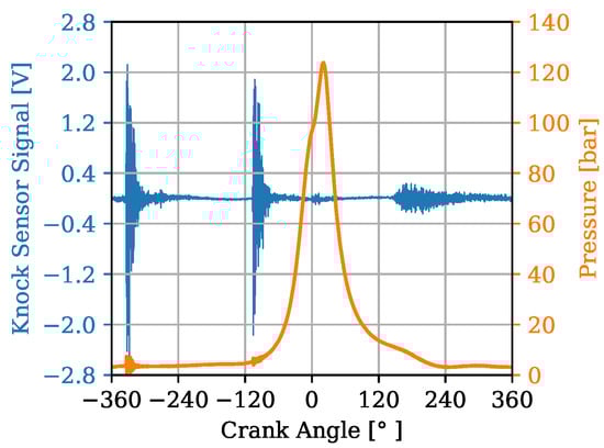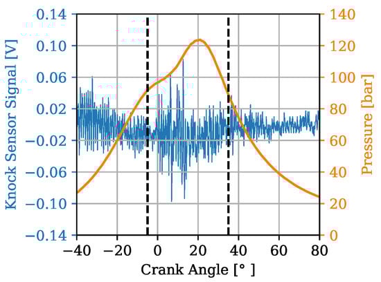 In Figure 7 and Figure 8, an example of a cycle is shown where the KS signal in presented in blue with the corresponding axis on the left. In addition, the in-cylinder pressure is plotted in orange with its associated axis on the right. The time range of the signals recorded from the KSs is from  to 360 °CA. Since the goal is to receive accurate estimations of combustion parameters it must be ensured that a relevant window slice is taken from the combustion stroke of the cycles. Due to a transfer function of the engine block from the combustion chamber to the KS a possible delay in the signals has to be taken into account. Diverging from the study of [], in which a window was chosen ranging from 20 to 80 °CA, a window ranging from  to 35 °CA was selected here. This is in accordance with to the findings of []. It is of great importance to select an appropriate window of the signals that depicts the phenomena of interest and excludes irrelevant ones. Therefore, this choice is designed to exclude, for instance, the prominent clapping noise from the intake and the exhaust valves which can be observed by looking at the high-amplitude regions of the blue signal on Figure 7. A major portion of the combustion phase with regard to the PFP is included in the window slice shown on Figure 8.