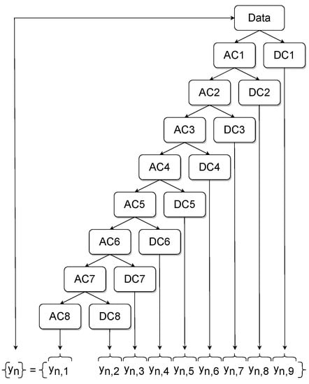The main idea of discrete wavelet transform is the decomposition of a given signal into a number of levels, where each level is a time series of coefficients describing the evolution of the signal in corresponding frequency bands []. There are two kinds of wavelet transforms: the continuous and the discrete one.