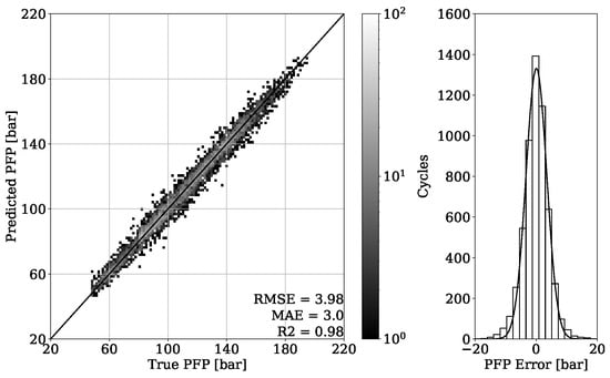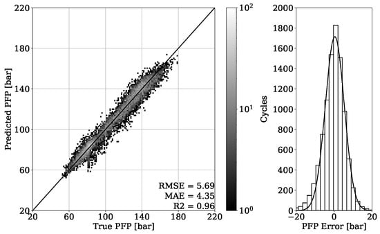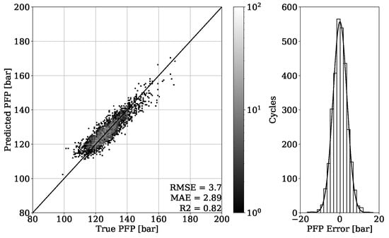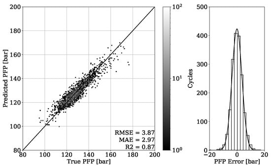In Figure 11, the regression result from validation set of engine 1 is presented. It can be seen that the obtained model is able to accurately estimate the in-cylinder PFP from engine vibrations, which is proven by achieving a MAE of  bar. The error distribution of Figure 11 shows a Gaussian characteristic with the mean error value around zero, indicating no systematic error. To be able to evaluate the model generalization properties, different operating conditions are tested, as shown in Figure 4. The MAE of  bar given in Figure 12 is slightly higher compared to the validation set. Nevertheless, the major concentration of cycles, which is indicated by the light-gray color, is very close to the perfect fit. This can also be observed by looking at the error distribution diagram of Figure 12.