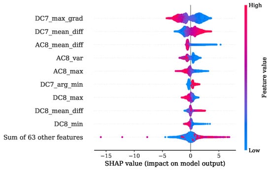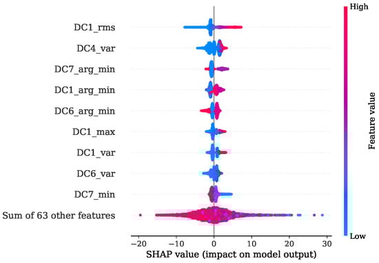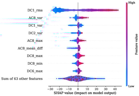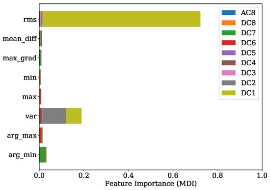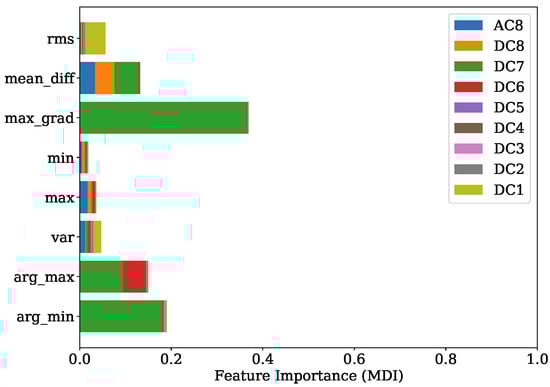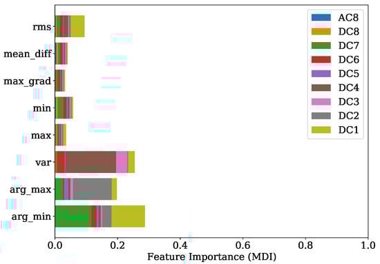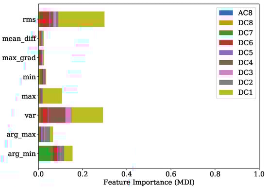 Figure 13 shows the FI values of the training procedure as a stacked histogram in which the designated colors represent the corresponding DC of all DWT levels, including the AC of level 8. The root mean squared (RMS) feature of level 1 contributes by far the most to this. The second most informative features are the variances from level two and level one. In comparison to this evaluation a summary representation of the SHAP values is presented in Figure 14 as a bee swarm diagram, summarizing various impacts of the model output. Here, every cycle analyzed is represented by a dot. On the x-axis, the SHAP values are given, whereas the y-axis shows a list of the nine most-contributing features resulting from this analysis. An associated colormap marks the feature values, where the magenta color stands for a high value in contrast to the blue color. It is shown that this method is in good accordance with the FI analysis and finds the variance of the AC from level eight as additional important contribution. Note that the point cloud of the remaining 63 features is disarranged in color.
