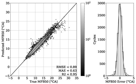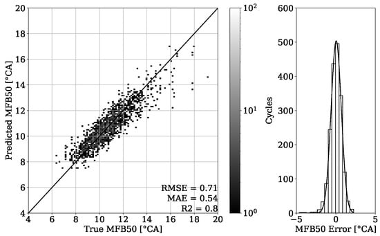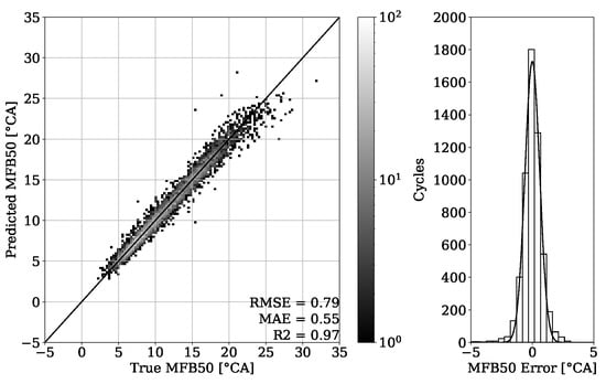 The results of combustion phasing parameter MFB50 on Figure 19 and Figure 20 show an accurate estimation capability of the presented approach. The MAE for the validation set of engine 1 is  °CA with no systematic error occurring and the MAE of the test set experiment from the same engine is  °CA. Besides this good general performance, it can be noted that at higher MFB50 values, individual cycle events tend to be further away from the perfect fit. This can be explained by a late combustion process, which has usually a flat pressure curve characteristic with no distinct peak. Thus, the resulting small gradients can make a correct estimation of the MFB50 more challenging. Since this is a condition that to this extent occurs only occasionally, these particular cycles are poorly represented within the dataset.