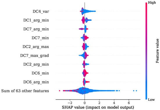 Figure 17 shows the FI based on MDI. It can be seen that the RMS and variance together with the location of minimum are the most prominent features. Features coming from levels 1, 4, 6 and level 7 in particular are ranked as important. The overview obtained from the SHAP representation of Figure 18 is in good accordance to the findings of the FI based on MDI. The results show that most of the selected features contribute to achieve a better performance. This is also indicated by the distinct magenta point cloud of the remaining 63 features.