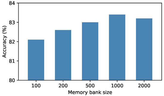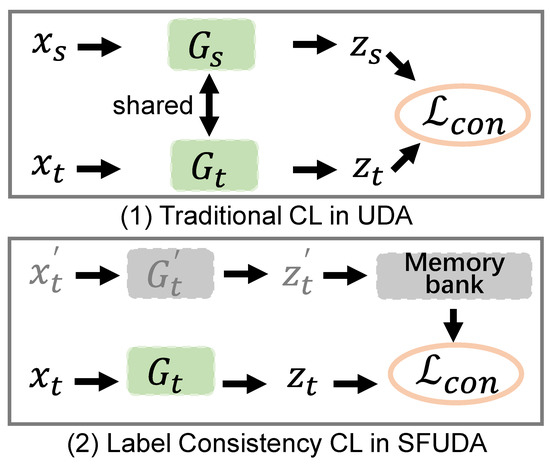 where denotes a sample in the target domain. The key value is the historical characteristics of the samples stored in the memory bank. is the sample set of the same class as the query samples in the memory bank, and is the sample set of all classes different from the query samples in the memory bank. It should be noted that the size of the memory bank is fixed to L. When updating, it is the same as the queue storage. The latest sample features are sent to the queue, and the features at the end of the queue are eliminated. Moreover, denotes the cosine similarity and is a temperature factor.