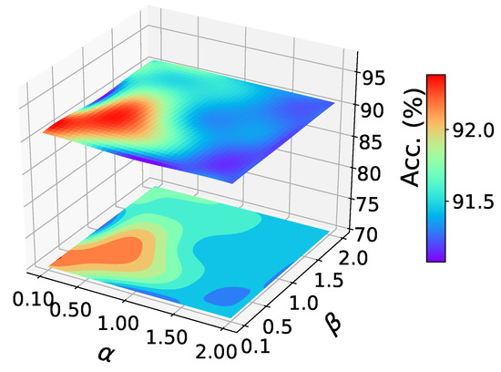 Parameter sensitivity analysis. As shown in the figure, we studied the sensitivity of our method to parameters and . We randomly conducted experiments on A→W of office-31, and reported the results in the Figure 3. There are similar results on other tasks. It can be seen that the classification accuracy varies little in a large parameter range, which shows the stability of our method.