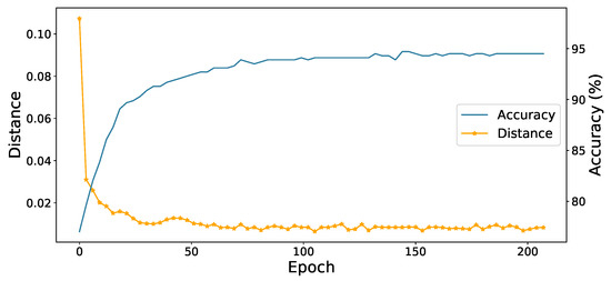 The accuracy of the model and average distance between sample and centroid with the epoch of training time on the A→D task in office-31.