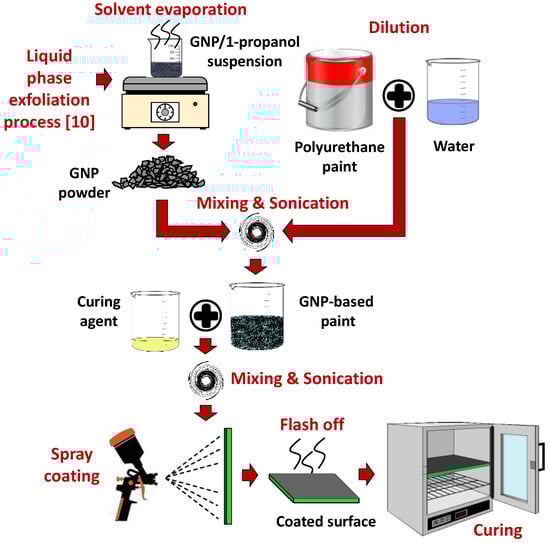 GNPs were produced by liquid phase exfoliation of thermally expanded graphite intercalation compounds (GIC) provided by Graftech Inc. (Parma, OH, USA) as described in [10].Dried GNPs were added to the PU paint diluted with tap water in the ratio of 10:2 (10 parts by weight of paint to 2 parts by weight of deionized water [12]). The mixture was first homogenized using a high shear mixer and then ultrasonicated for a few minutes to break up micro-agglomerates and to promote the optimum dispersion of GNPs into the paint.