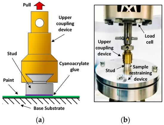 Sketch (a) and picture (b) of pull-off setup according to ASTM 5179.
