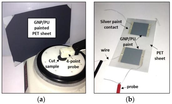 The other nanocomposites with 2 and 2.5 wt% of GNPs, due to their higher electrical resistance, were characterized with a two-wire volt-amperometric method using a high-resistance meter/electrometer (Keithley 6517B). For this purpose, before measurement, rectangular (4 cm × 3 cm) specimens were cut from the GNP/PU painted PET sheets; for each sample, two copper wires were then glued with conducting epoxy to two silver paint electrodes (0.5 cm × 3 cm) previously deposited on the opposite extremities of the film’s surface (Figure 3b).