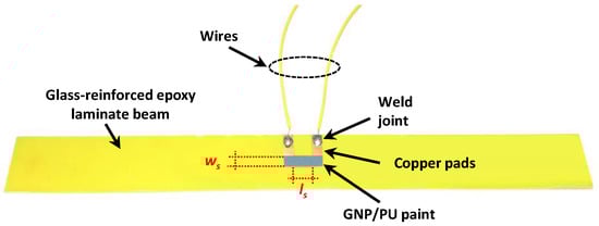 GNP/PU paint (ws = 5 mm; ls = 8 mm) deposited between two copper pads on a FR4 beam for electromechanical tests.