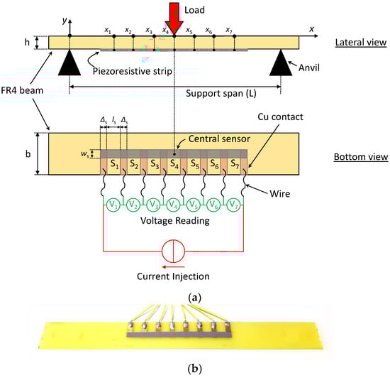 Let us now assume the presence of seven thin sensors deposited on the bottom surface of the beam, as sketched in Figure 5a. The x-position of the centers of the first three sensors (S1, S2, S3) can be calculated as: