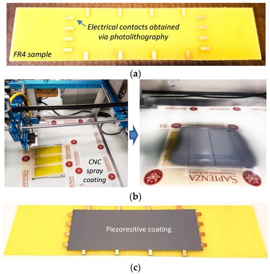 Picture of an FR4 rectangular sample with copper pads before the coating process (a); CNC x-y plotter equipped with an airbrush during the spray deposition of GNP-filled paint (b); FR4 sample with the piezoresistive coating (c).