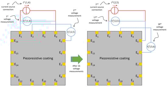 Sketches showing the adopted current injection–voltage measurement method. Only the current injection between two pairs of electrodes and two consecutive voltage measurements for each current source connection are represented for the sake of simplicity.