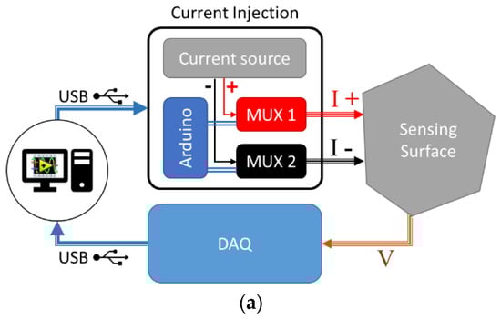 - Cagáň, J. Hardware implementation of electrical resistance tomography for damage detection of carbon fibre–reinforced polymer composites. Struct. Health Monit. 2017, 16, 129–141. [Google Scholar] [CrossRef]