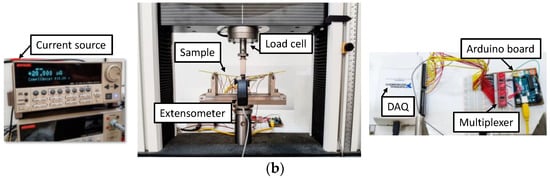 The entire acquisition system of the measurements for ERT, schematized in Figure 8a and illustrated by pictures in Figure 8b, comprised a Keithley current source, two 16-channel analog/digital multiplexers/demultiplexers, an Arduino board and a National Instruments USB-6210 16-channel DAQ. The injection current was switched among the different electrode pairs by the two multiplexers, driven by the Arduino board. The voltage between the electrodes was measured with the DAQ board in a single-ended configuration. The whole instrumentation was controlled by a LabVIEW VI, built with a “simple state machine” architecture. In Figure 8b, the universal testing machine is also shown.