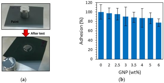 Adhesion strength between the coating and the substrate as a function of the GNP concentration: (a) picture of a sample before and after the test; (b) adhesion as a function of GNP content in the paint.