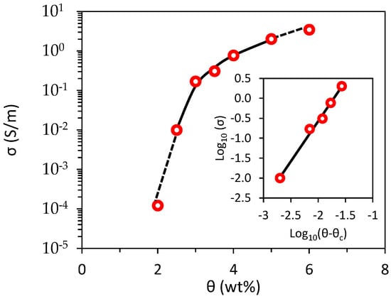The experimental data of the percolation curve are reported as symbols in Figure 11; the σ-θ curve was obtained by fitting the data with the well-known power law equation: